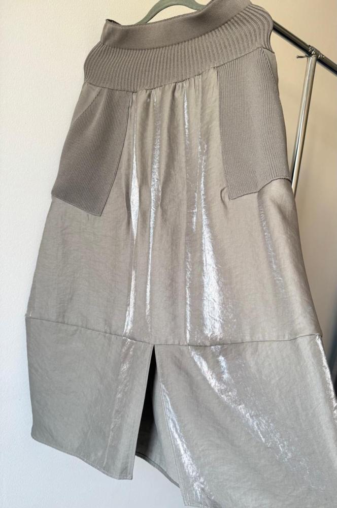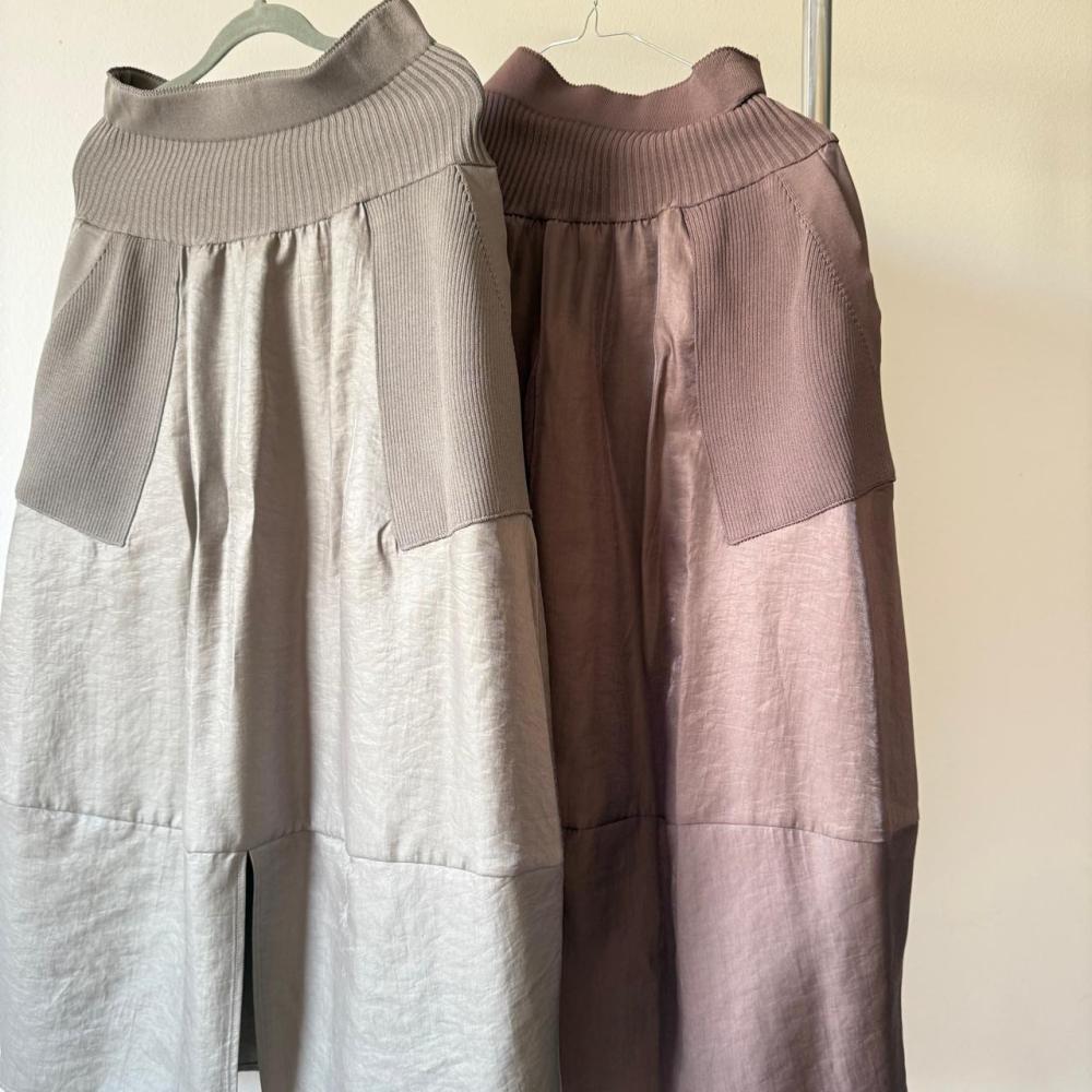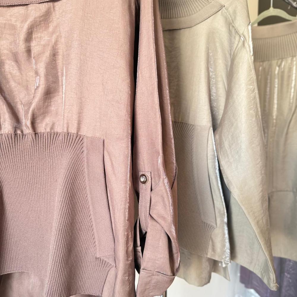 - الخامة: قماش ناعم بلمعان خفيف مع أجزاء محبوكة مرنة.