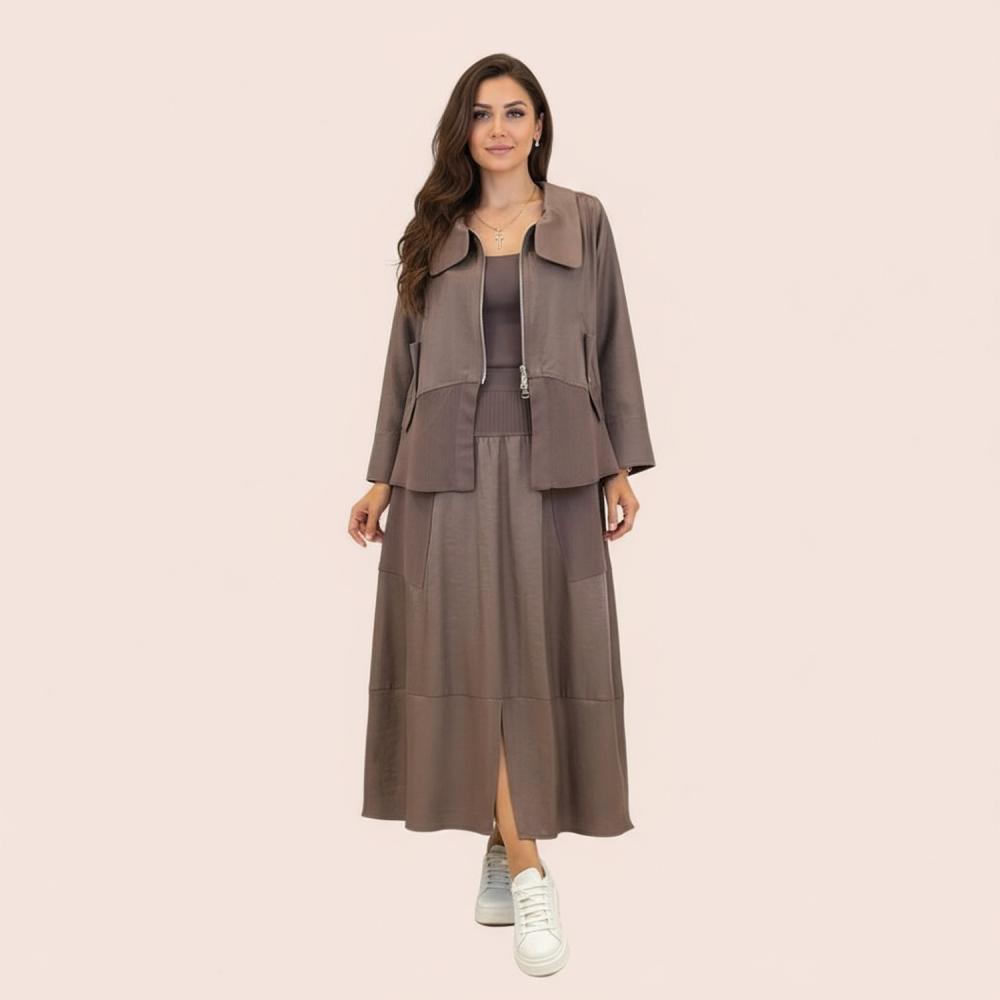 - بلوزة وتنورة خاكي تتميز بخامة ناعمة بلمعان خفيف تمنح مظهرًا مرتّبًا في الإضاءة الداخلية والخارجية مع إحساس لطيف على البشرة طوال اليوم.
